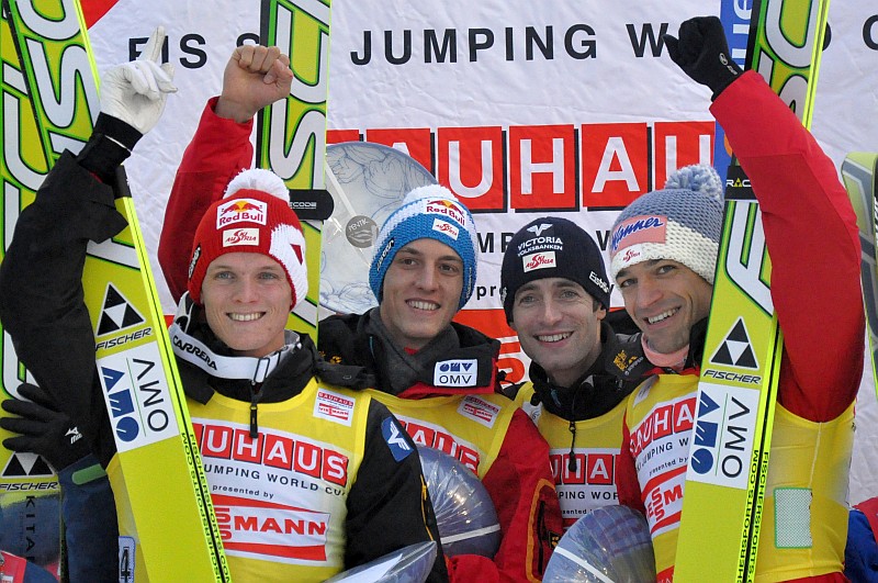 Za podium w realizacji drużynowej znaleźli się Niemcy, którzy w ostatniej turze po słabszym skoku Freunda (123,5 metra) musieli uznać wyższość rywali. Piąte miejsce zajęli Słoweńcy, a szóste Czesi, którym przyzwoite miejsce zapewnił Roman Koudelka, uzyskując w swoim skoku aż 142 metry.